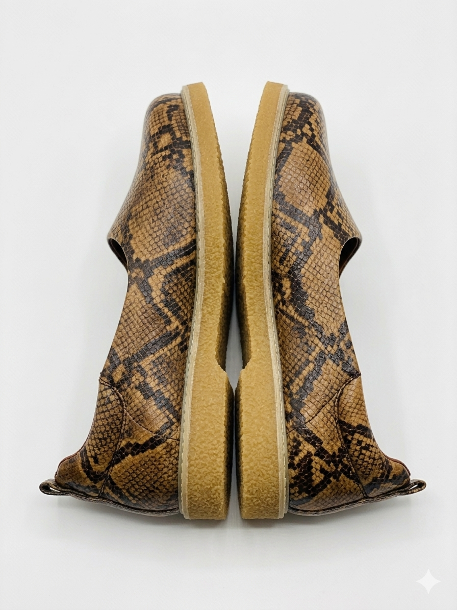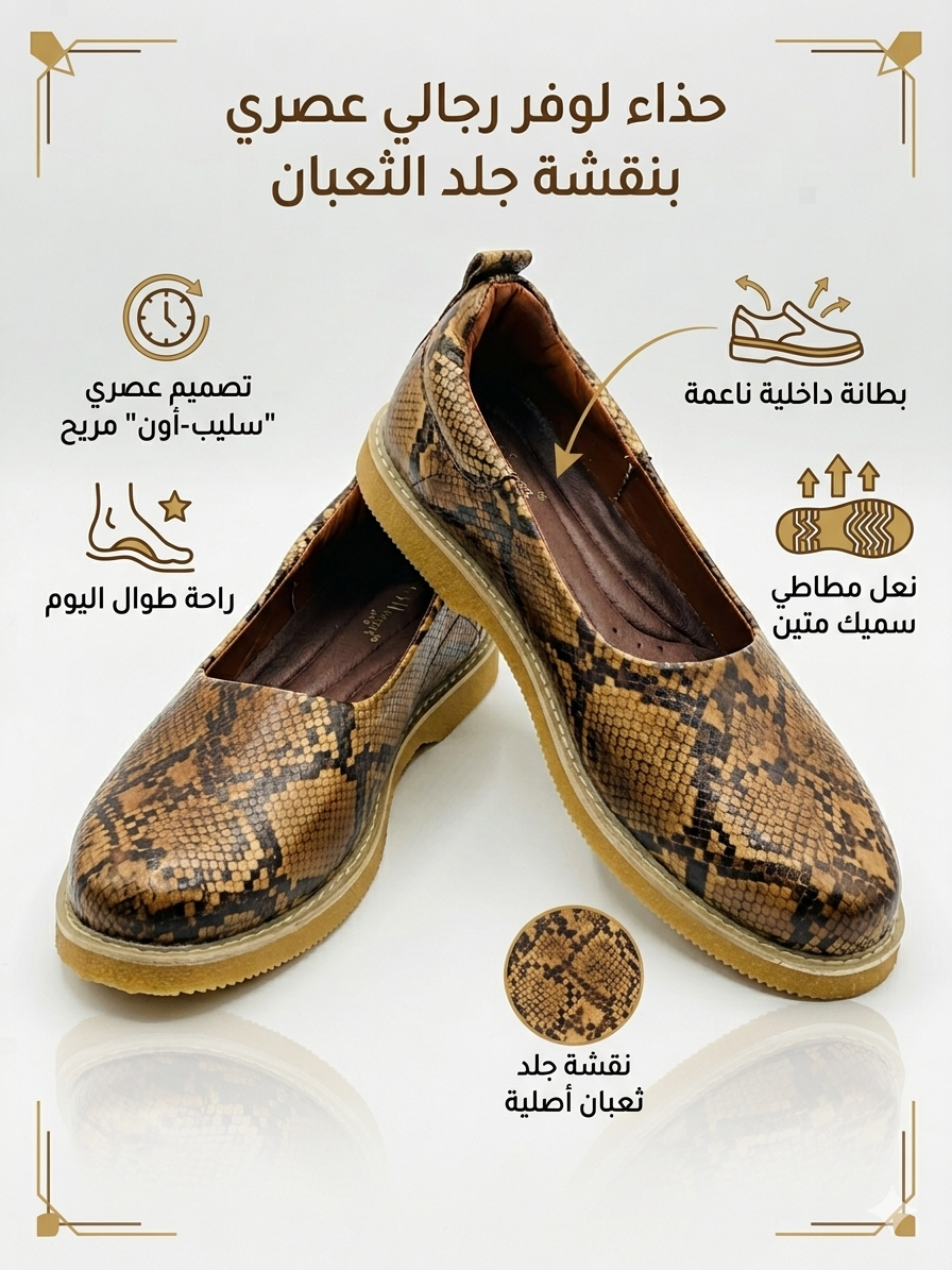 حذاء لوفر رجالي مستوحى من المركوب السوداني، بتصميم فاخر ونقشة جلد الأصلة(ثعبان) التي تضيف طابعًا مميزًا وجذابًا لإطلالتك